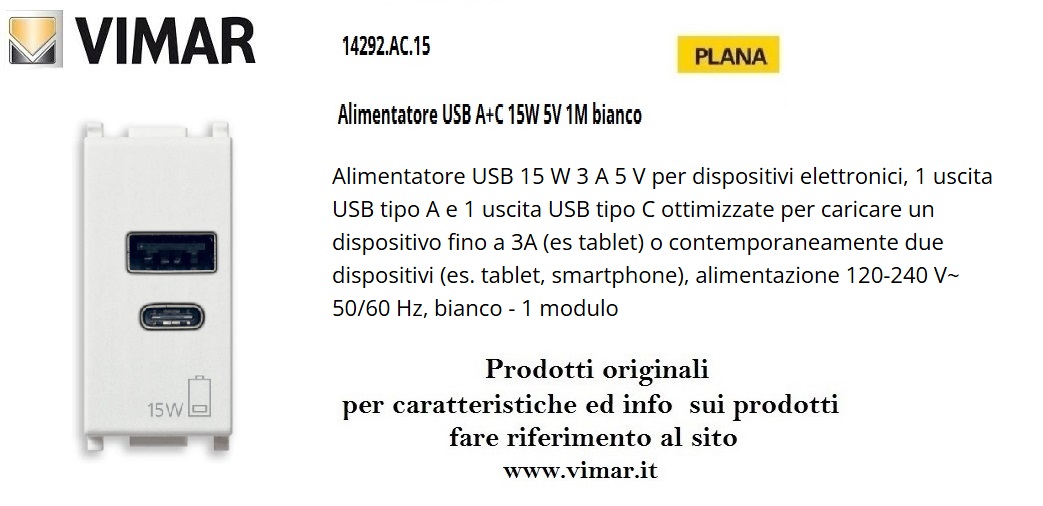 ALIMENTATORE USB A+C 15W 5V VIMAR PLANA 14292.AC.15 BIANCO