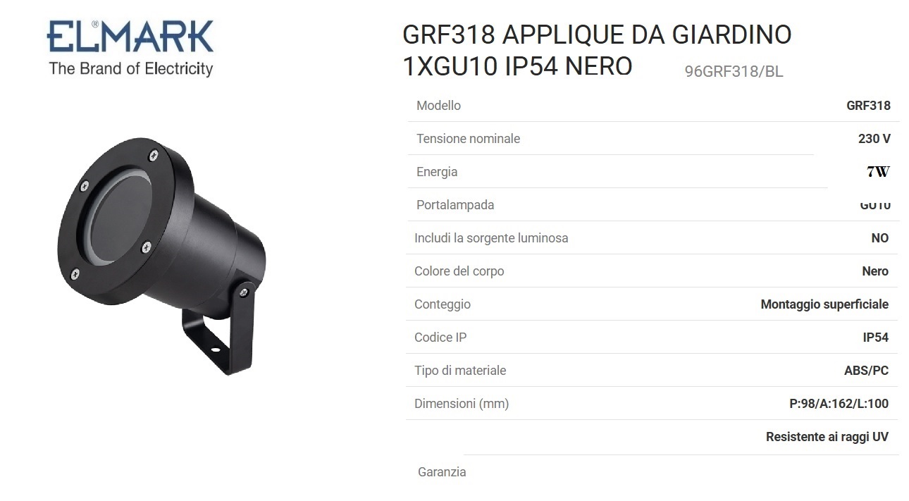 APPLIQUE DA GIARDINO 8W GU10 IP54 NERO 96GRF318/BL