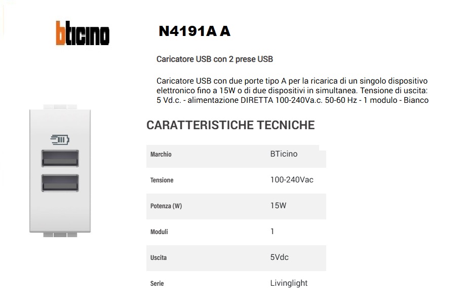 CARICATORE USB A+A BTICINO LIVING LIGHT N4191AA