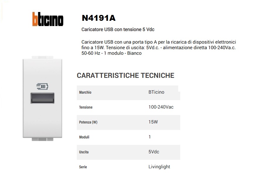 CARICATORE USB BTICINO LIVING LIGHT N4191A