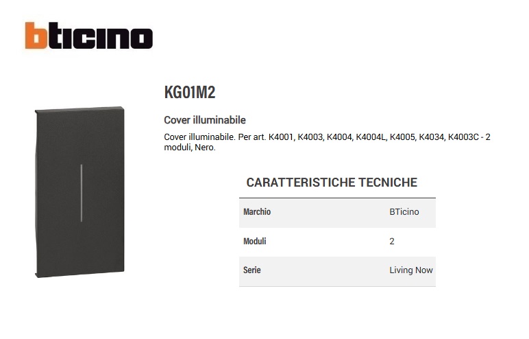 COVER COMANDO ILLUMINABILE 2 POSTI KG01M2 BTICINO NOW NERO