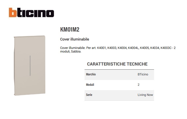 COVER COMANDO ILLUMINABILE 2 POSTI KM01M2 BTICINO NOW SABBIA
