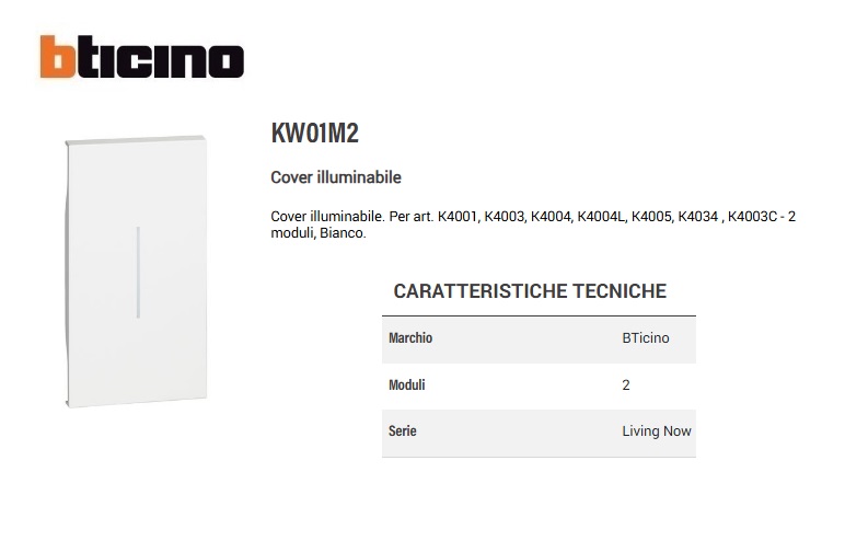 COVER COMANDO ILLUMINABILE 2 POSTI KW01M2 BTICINO NOW BIANCO