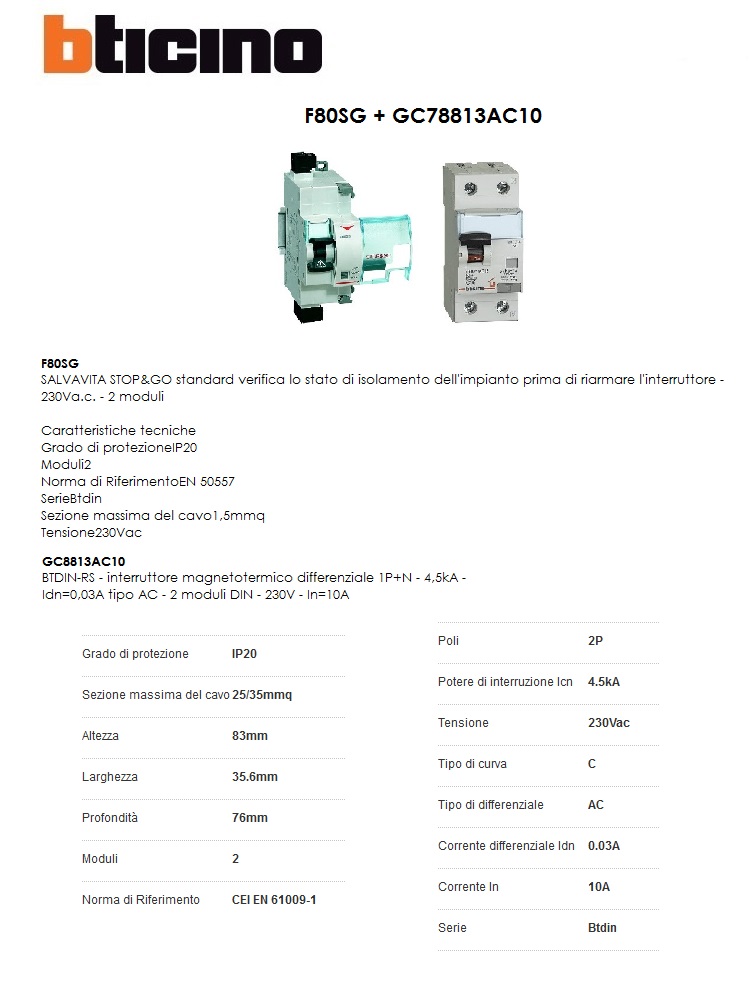 F80SG GC8813AC10 SALVAVITA 10A MAGNETOTERMICO BTICINO STOP e GO