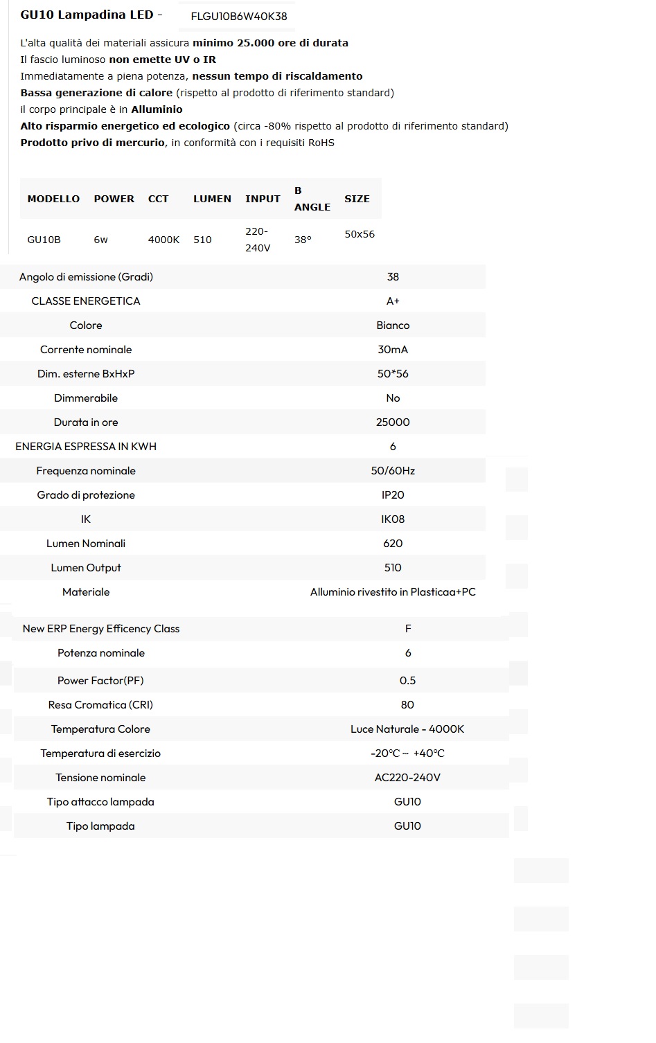 GU10 Lampadina LED - 6W 4000K 510LM 38° CRI>80