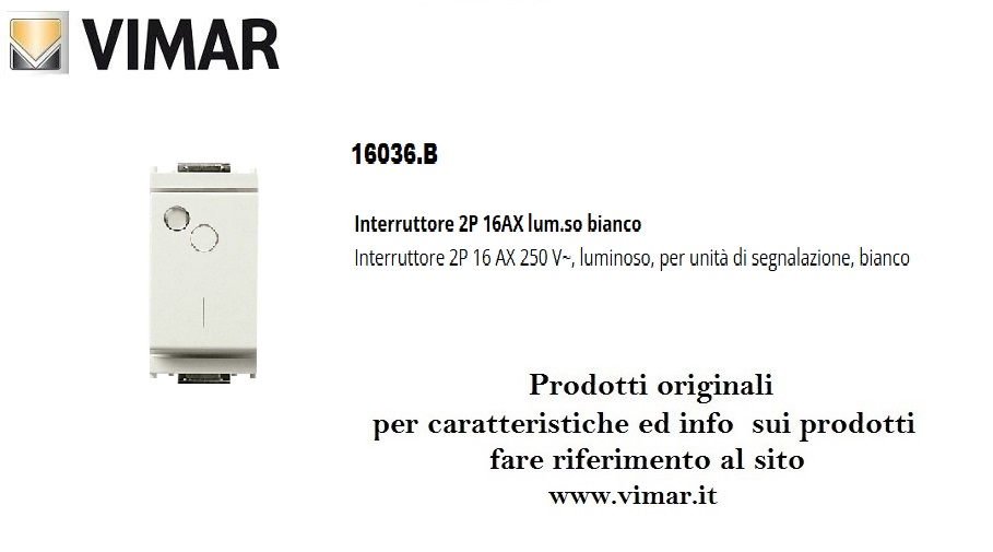 INTERRUTTORE BIPOLARE LUMINOSO 16AX 163036.B VIMAR IDEA BIANCO
