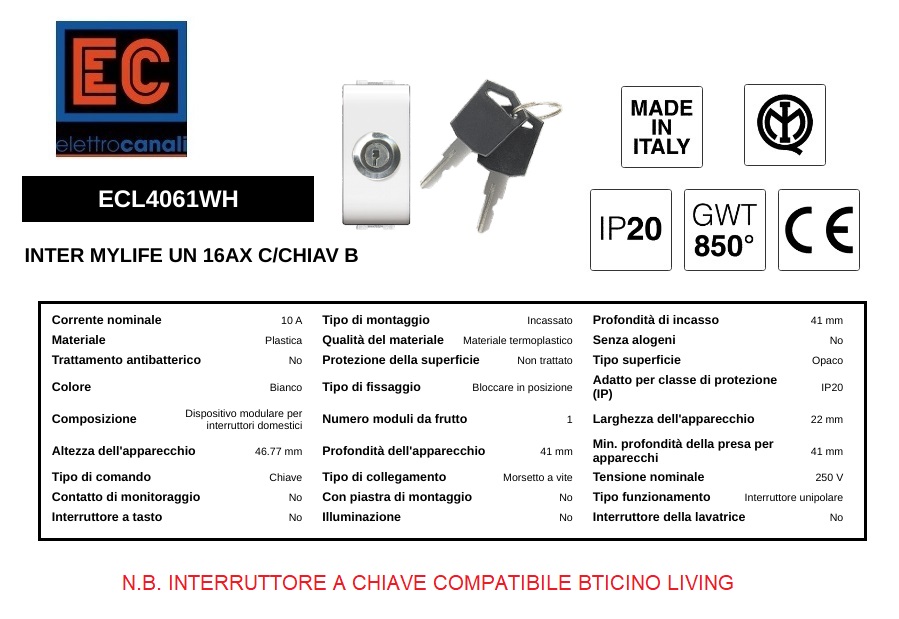 INTERRUTTORE CON CHIAVE MYLIFE ELETTROCANALI ECL4061WH COMPATIBILE BTICINO LIVING LIGHT