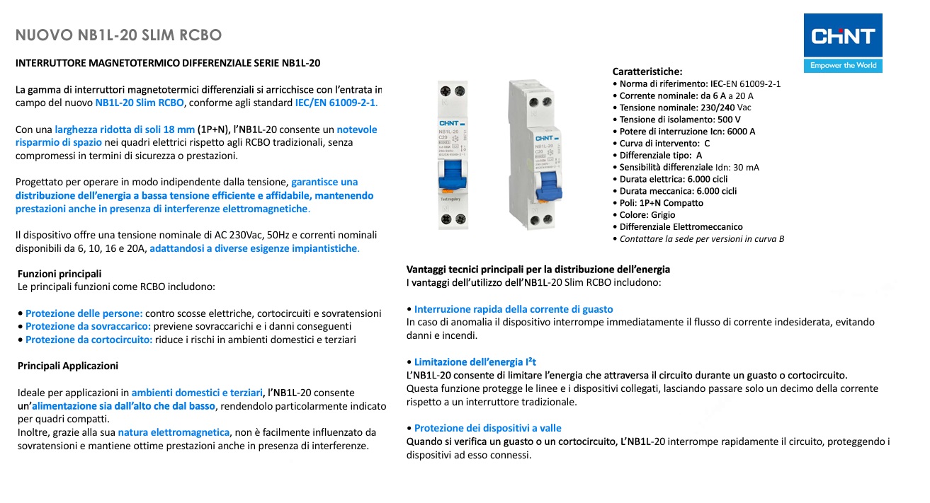 INTERRUTTORE DIFFERENZIALE MAGN. 6 A 30mA 6kA CUR.C 1PN CHINT 586787 NB1L-20