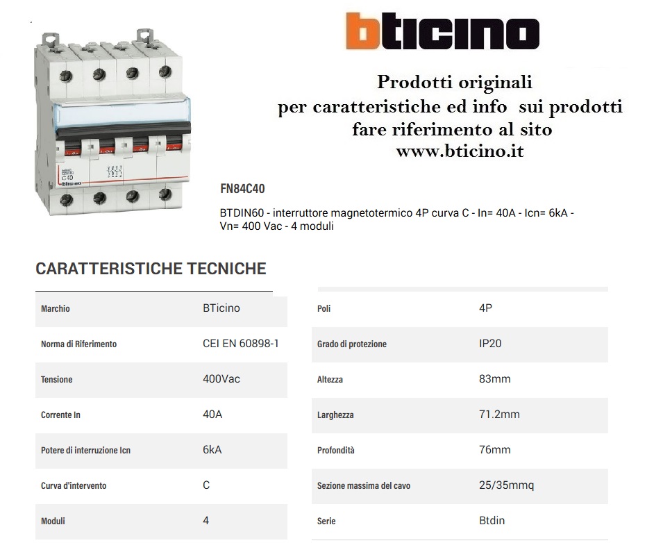 INTERRUTTORE MAGNETOTERMICO BTDIN60 4P 40A C BTICINO FN84C25
