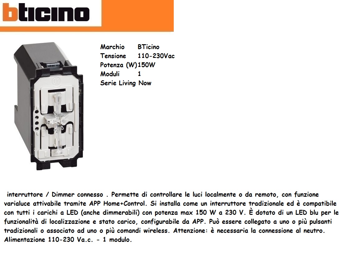 K4411C INTERRUTTORE DIMMER CONNESSO BTICINO LIVING NOW