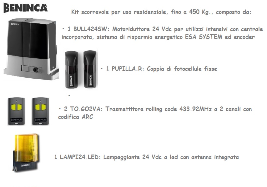 KIT 24VCC AUTOMAZIONE CANCELLO SCORREVOLE MAX 450 KG BENINCA KBULL