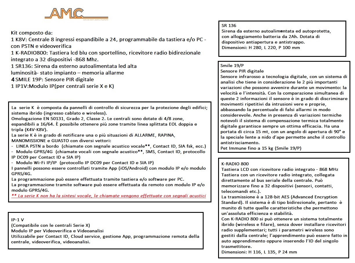 KIT AMC CENTRALE K8V K-RADIO800 MODULO IP SENSORE SIRENA TASTIERA