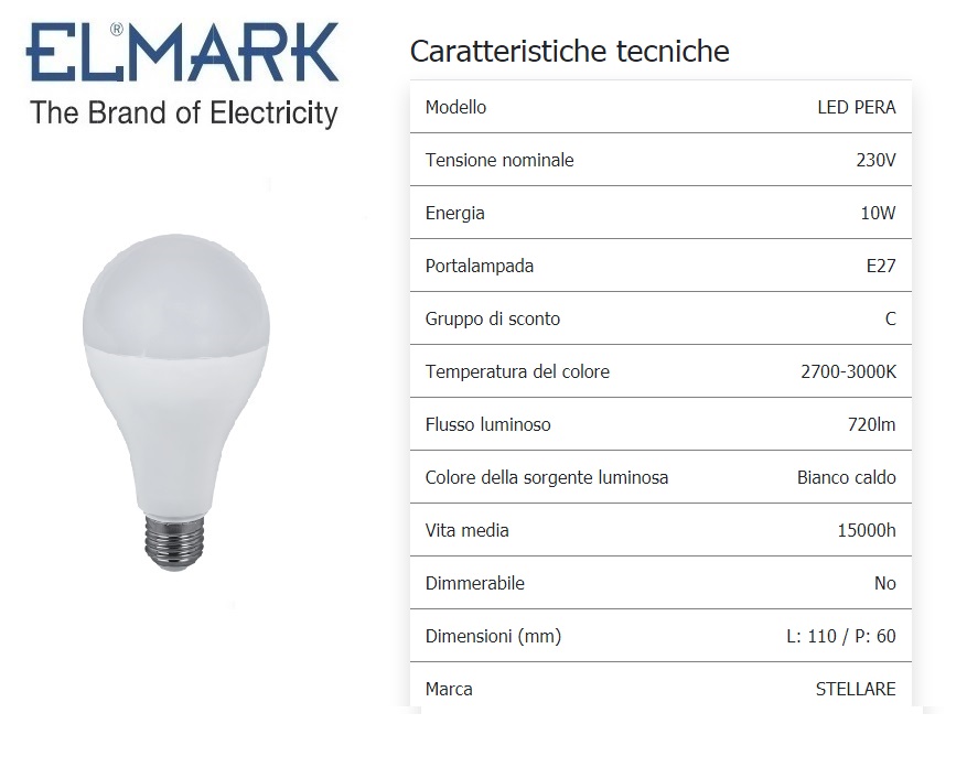LAMPADA STELLARE LED PERA 10W E27 230V 2700-3000K BIANCO CALDO 99XLED585