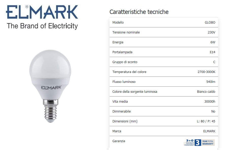 LAMPADA LED GLOBO 6W E14 230V BIANCO CALDO 2700-3000K 99LED747