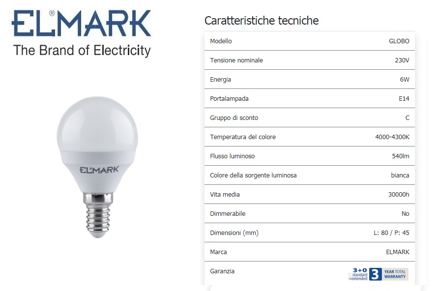LAMPADA LED GLOBO 6W E14 230V BIANCO 4000-4300K 99LED746
