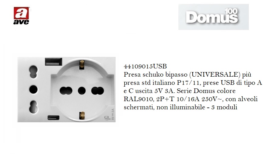 PRESA SCHUKO + BIPASSO + USB A+C AVE DOMUS 44109015USB