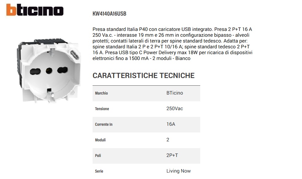 PRESA SCHUKO CON USB KW4140A16USB LIVING NOW BTICINO BIANCO