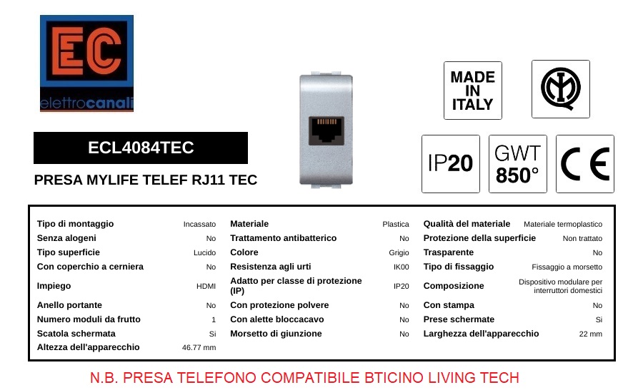 PRESA TELEFONO RJ11 MYLIFE ELETTROCANALI ECL4084TEC