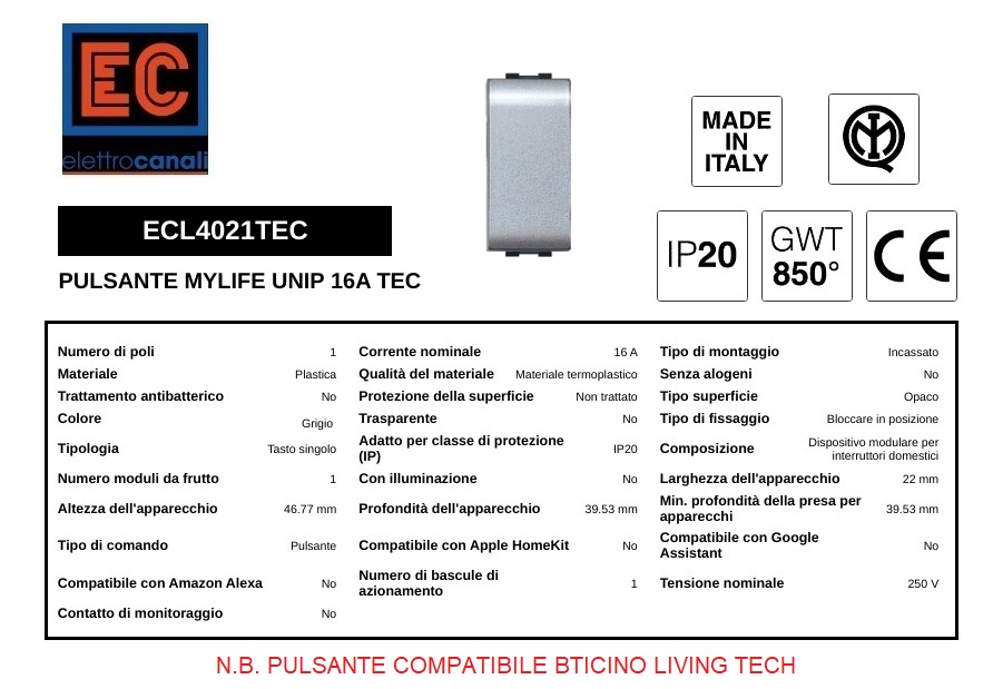 PULSANTE MYLIFE ELETTROCANALI ECL4021TEC