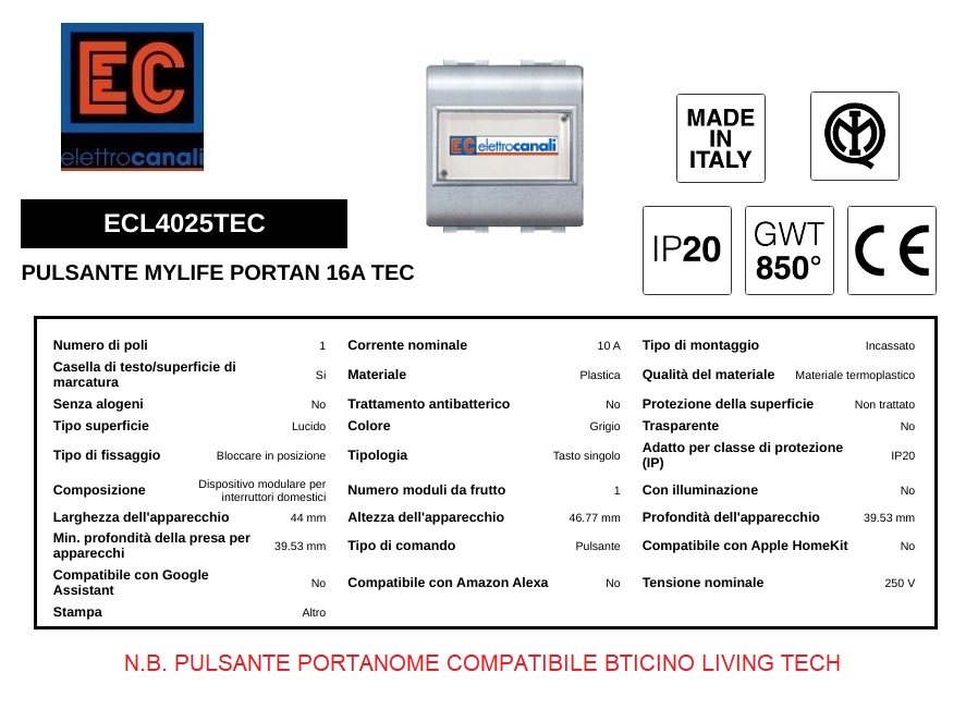 PULSANTE PORTANOME MYLIFE ELETTROCANALI ECL4025TEC