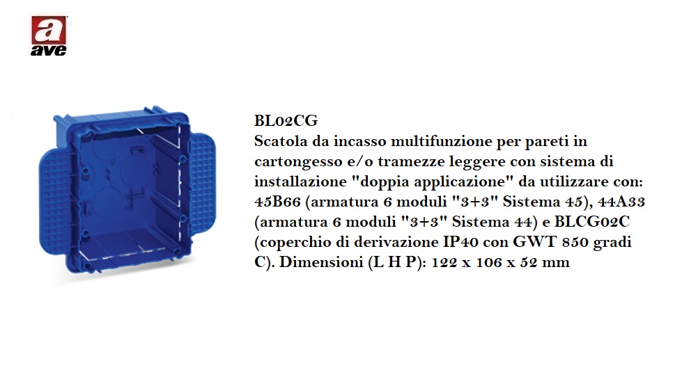 SCATOLA INCASSO 122x106x52mm AVE PER CARTONGESSO BL02CG