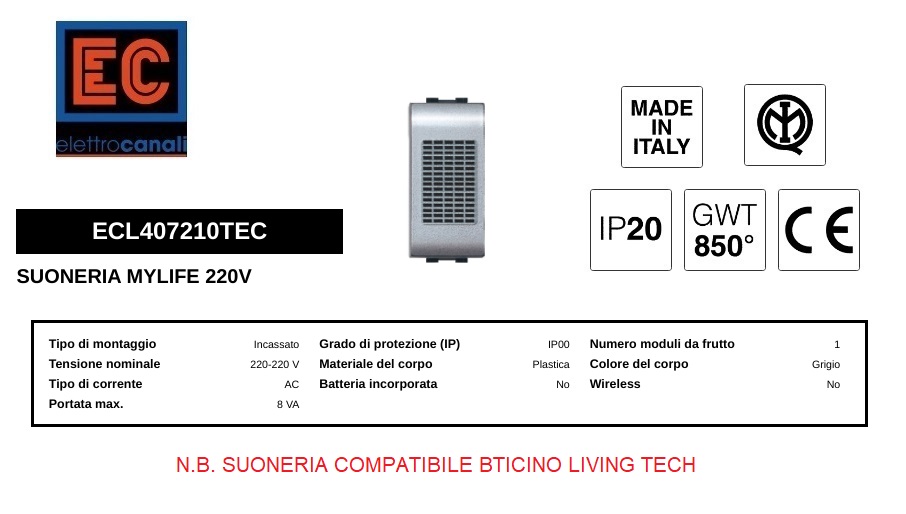 SUONERIA 220V MYLIFE ELETTROCANALI ECL407210TEC