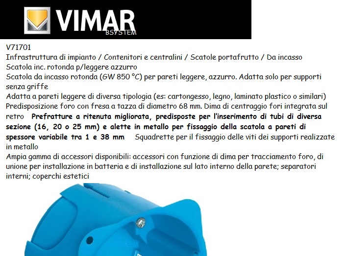 V71701 SCATOLA TONDA CARTONGESSO VIMAR